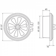 Rosettventil med vridspjäll och öppningsbar lucka. Utvändigt diameter 157 mm. Diametern på den svagt koniska stosen är 120 till 125 mm.