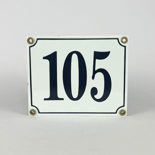 White enamel sign with number 105 - perfect for house numbering with clear dark blue text on a white background.