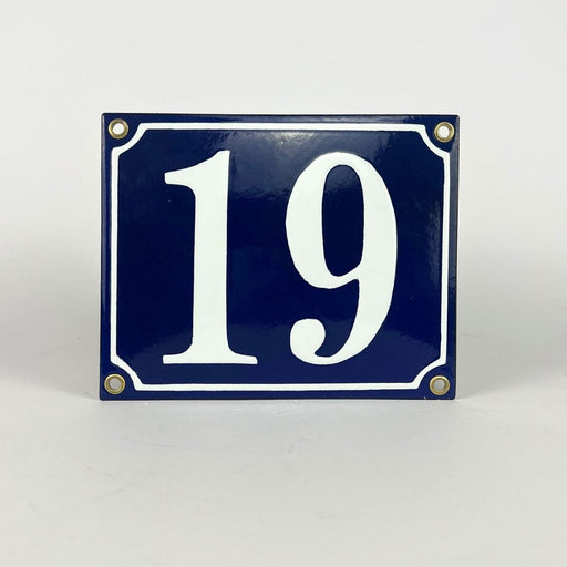 Classic blue enamel sign with the number 19 - perfect for house numbering with clear white text on a deep blue background. Size: 15x12cm
