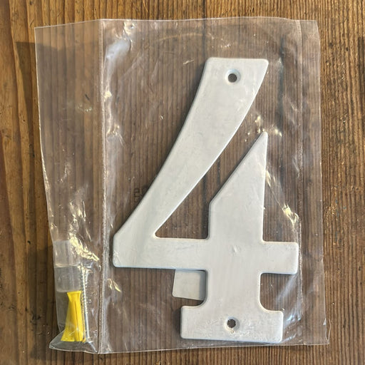 White house number "4". Includes mounting accessories for easy installation on wall or door. Height: 14 cm