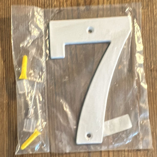 White house number "7". Includes mounting accessories for easy installation on wall or door. Height: 14 cm