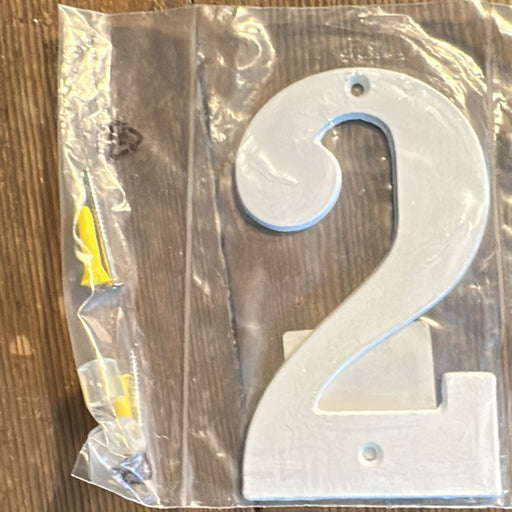 White house number digit "2". Includes mounting accessories for easy installation on wall or door. Height: 14 cm