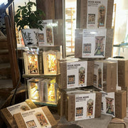 Miniature viewing cabinets that you assemble yourself and place between the books. Each model is carefully designed with small details and warm lighting that creates depth and atmosphere.