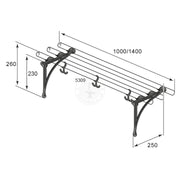 Täydellinen hattuteline valittavana 1 m tai 1,4 m pituisilla tangoilla ja valurautaisilla yksityiskohdilla niklattu tai mustaksi lakattu. 1m hyllyt sisältävät 3 ankkakoukkua ja 1,4m hyllyt sisältä...