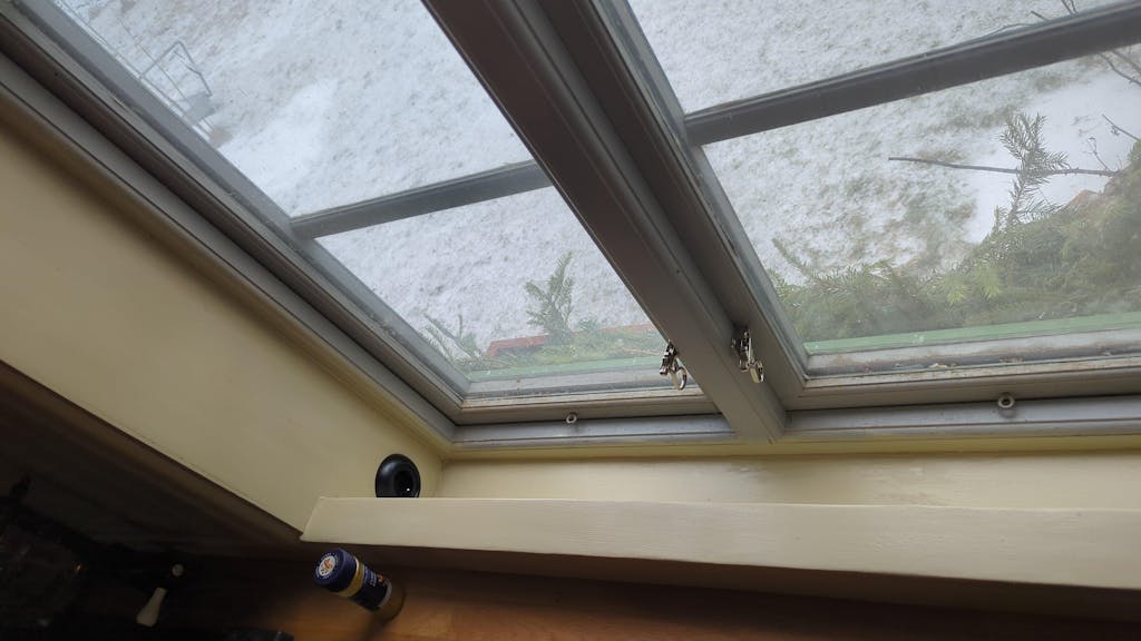 Mycket fin kulör som ger en levande, varm ton till taket. Det krävdes tre lager för att få bort alla skiftningar från ett lager med spärrfärg som förhindrar genomblödning.
